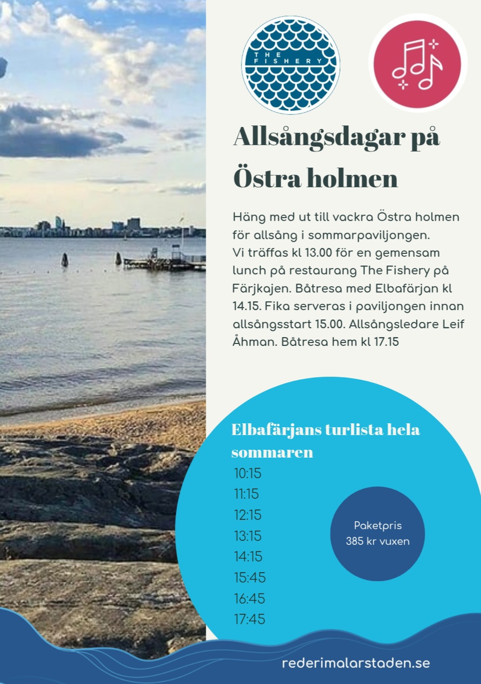 Med 128-års jubilerande M/F Elba kan du nå både badön Östra Holmen, campingen på Johannisberg med sin fina badstrand och Öster Mälarstrand med lekplats Poesiparken, Restaurang Bryggan, badpalatset Kokpunkten och övriga fina miljöer runt Lasse Färnlöfs plats.